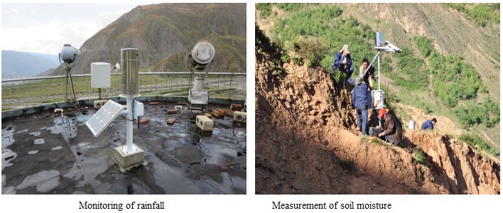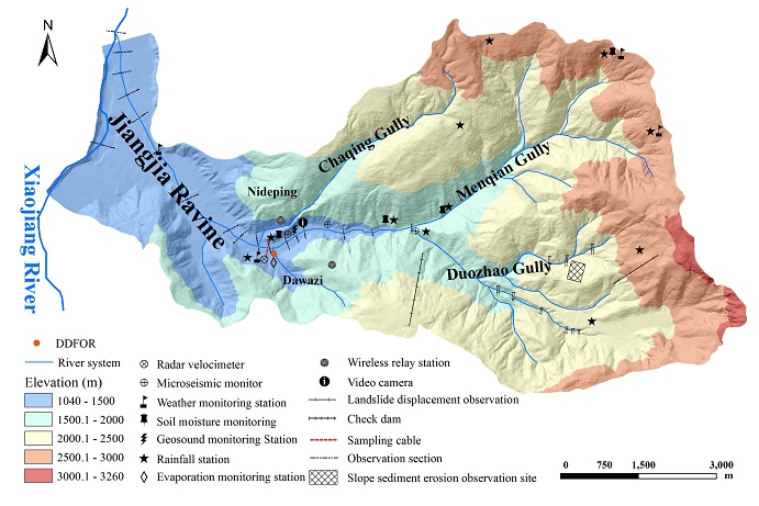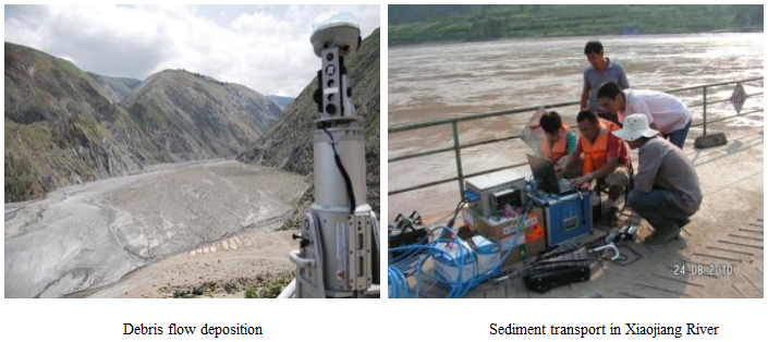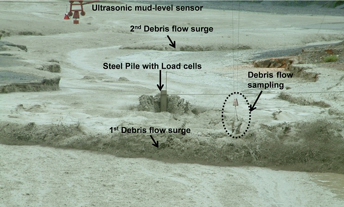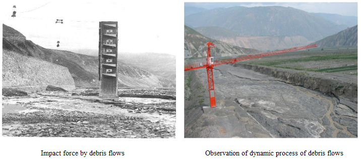 The main channel of the Jiangjia Ravine is divided into three sections with different morphologic characteristics: (1) the erosion zone, 10 km long with a 17° slope on average; (2) the transportation zone, 1.3 km long with a 5.1° slope on average, with great cross-sectional variation up to 16 m in depth caused by scouring and silting of previous debris flows; (3) the deposition zone, 4.2 km long with a 3.7° slope on average. DDFORS is located in the transportation zone of the Jiangjia Ravine. The observations usually focus on a straight valley that is 270 m long on a 3.4° slope. The cross-section is rectangular and instruments are installed on two banks for observation and recording flow properties.