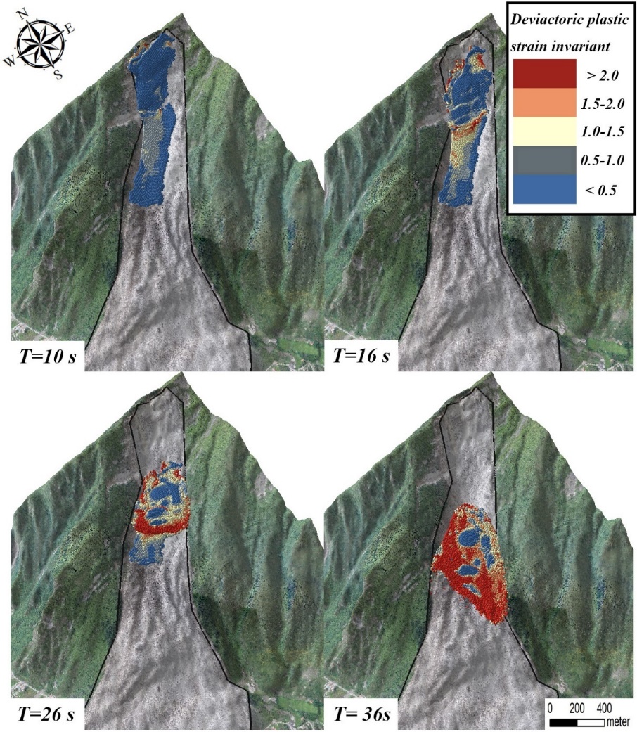 大型岩滑—碎屑流灾害由于其巨大的势能,通常对山区群众的生命和财产安全构成严重的影响。成都山地所何思明研究员团队以四川省茂县新磨村滑坡为研究对象,通过三维物质点法再现了起动阶段源区岩体相对整体运动到沿程冲击侵蚀滑坡堆积体,并逐渐解体破碎到最终转变为碎屑流成灾全过程。该研究考虑了滑坡基底摩擦弱化效应与滑体内部剪切软化变形影响,并通过滑体等效塑性偏应变反映“岩滑—碎屑流”逐渐碎裂解体过程,研究发现滑坡体对老滑坡堆积体的冲击侵蚀作用是控制滑坡堆积区东西分布特征的主控因素。研究成果对揭示大型岩滑—碎屑流灾害动力学机制,科学评估灾害风险有重要指导作用。