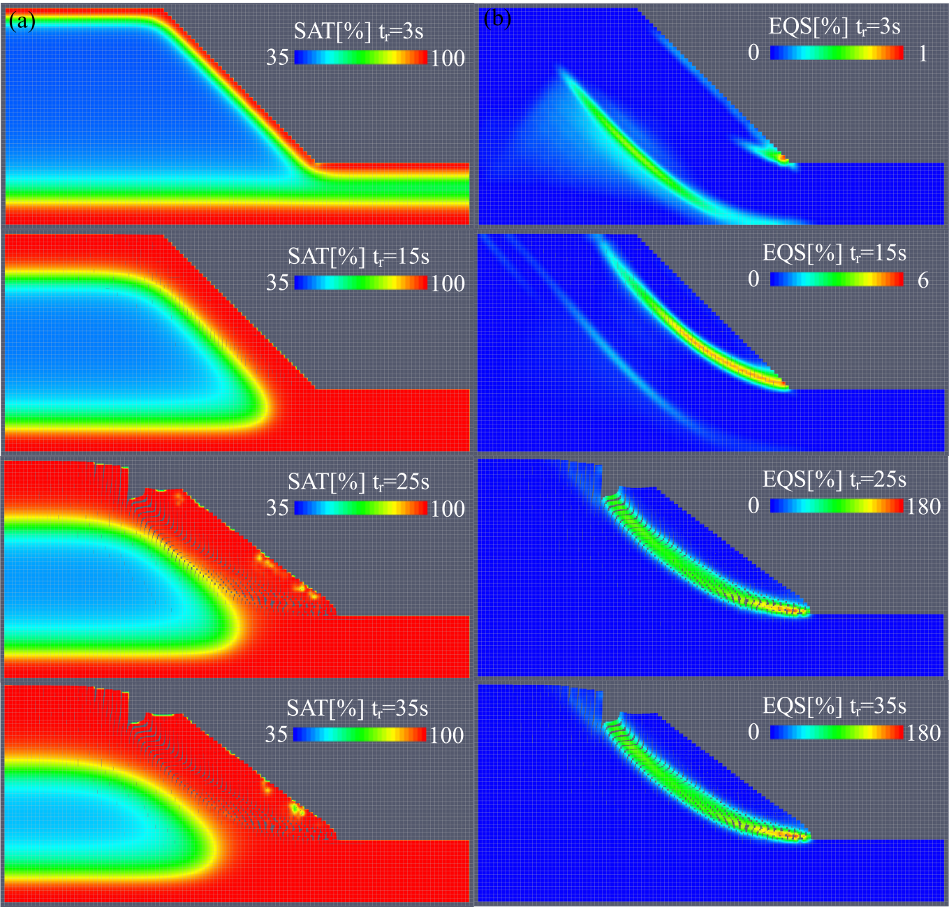 温度-降雨-变形耦合条件下斜坡体降雨失稳过程饱和度及剪切应变模拟云图