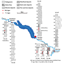 研究团队通过开展详细的地质调查和研究工作,在易贡湖上下游发现滞流沉积、溃决洪水沉积和冰水沉积,采用光释光和14C测年及水力学模拟等方法确定了两期古洪水的年代(9.2 ka和7ka)和两期近现代洪水(1902年和2000年)的水文特征(图1)。研究发现,易贡湖的存在对河流泥沙的输移有三个显著的效应:削弱了上游的大型洪水,扩大了由下游堰塞坝导致的堰塞湖的蓄水量,截留了大量的来自青藏高原的泥沙。同时,研究还认为雅江下游干支流的宽谷、堰塞坝和NB-GP区边界共位可能是限制大量青藏高原泥沙输送到雅江大峡谷以下河段的主要原因之一。这一研究表明,重大灾害事件在青藏高原周边河流泥沙输移及地貌演变中起到关键的作用。