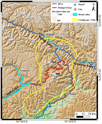 雅江下游宽谷段与NB-GP快速剥蚀区(黄色实线区域)的位置关系