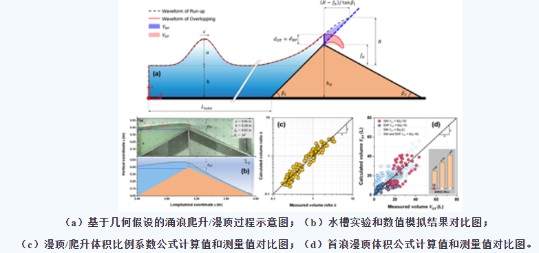 课题组基于几何学假设,利用自主设计的变宽度实验水槽及开源流体力学计算工具OlaFOAM?,通过设置不同的静水深度、涌浪高度、坝体迎水面倾角,得出了涌浪爬升和漫顶过程体积比例因子(Volume Ratio, k)计算公式,实现从传统涌浪爬升向涌浪漫顶过程的关键转换。通过研究,系统分析不同高度的孤立波(Solitary Wave)爬升和漫顶过程的关键参数,建立了涌浪漫顶过程首浪体积的计算公式,可实现仅通过涌浪高度、坝体高度等易测量物理参数对首浪漫顶体积的快速计算;并在此基础上,基于二维冰碛坝模型实验,最终建立了涌浪漫顶诱发冰碛坝溃坝释放总洪水体积的经验公式。研究成果可为准确研判冰湖溃决洪水的影响范围提供重要的动力学模型。