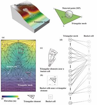 针对上述挑战,成都山地所张晓鹏博士、胡凯衡研究员及合作者提出了一种基于三角不规则网络模型与局部邻域搜索方案的三维物质点法高效模拟框架,改进了基于距离和密度水平集函数的点面接触检测算法。该研究通过三角不规则网络模型精准刻画复杂地形几何特征,并引入桶排序算法优化滑坡体与地形的接触检测过程,显著提升了粒子与三角网格匹配的计算效率。