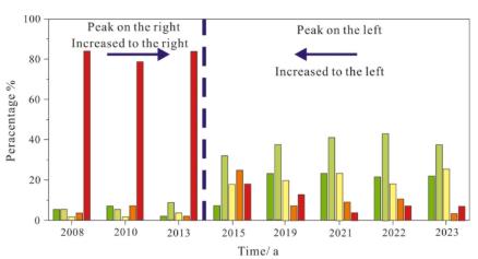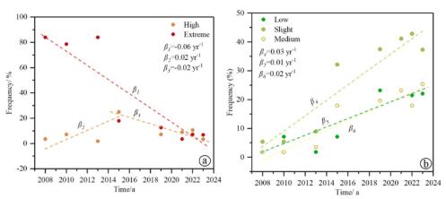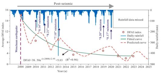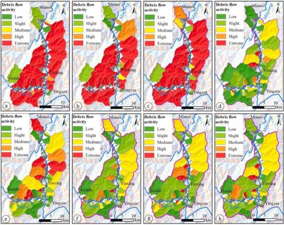 针对该问题,成都山地所熊江助理研究员、陈华勇研究员联合成都理工大学唐川教授及合作者们综合考虑了水文气象、地形地貌、物源发育对汶川地震震中区长期输沙效应与泥石流活动性演变互溃机制开展了长期观测与分析。研究表明,震初5年,岸坡及沟道内固体物质结构松散、粘聚力较低,极端暴雨极易导致固体物质起动补给泥石流,导致该时期大部分山区流域具有极高和高泥石流活动性。然而,随着松散堆积体压实固结及表面粗化过程加剧,泥沙供给能力显著降低,泥石流活动性逐渐由极高和高分别以−0.06 yr−1 和 −0.02 yr−1的速率向中等、低和极低活动性演变。震后受泥沙供给量逐渐减少,泥石流活动性整体以幂律规律衰减,且将持续近50年后才能恢复至震前水平。目前,汶川地震震中区约59.32%的流域泥石流活动性已经恢复至低水平,但仍有近10%流域具有极高和高泥石流活动性,且主要集中在草坡以北区域。本研究不仅提出了强震扰动区泥石流活动性时空演变监方法,更为理解同类型强震扰动区泥石流活动性长期动态演变规律提供了理论参考。