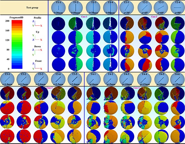 针对上述问题,中国科学院成都山地灾害与环境研究所何思明团队吴永副研究员等,基于离散元方法(DEM)研究了三维节理结构对滚石冲击破碎行为的影响,提出了“体积破碎率”等定量指标,并揭示了节理在影响破坏模式、能量耗散等方面的重要作用。研究基于室内试验与数值模拟相结合的方法,探讨了预存节理的几何特征(长度、角度、厚度、位置)对滚石冲击破碎的机制影响。