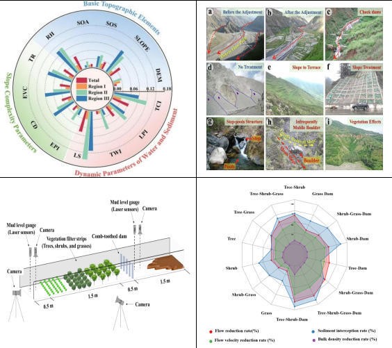 从流域尺度分析了自然微地貌中影响泥沙运移的关键驱动因子,研究基于高分辨率DEM,综合采用泥沙连通性指数(IC)、数字地形分析(DTA)、地理探测器(GeoDetector)与随机森林模型(RF),定量评估13类地貌指标对泥沙连通性的影响。结果显示:水动力相关因子(如LS因子和TWI)主导沉积物连通性空间差异,且指标间存在显著增强交互作用;从实验角度阐明了分段式植被布置与岩土协同减灾机制及效益,提出了一种将分段植被布局与梳齿坝相结合的生态-岩土措施,用于拦截泥石流。通过实地调查和水槽实验,我们确定了分段植被的最佳行距和株距。此外,我们还研究了由植被过滤带和梳齿坝组成的各种组合模型,以阐明它们在拦截泥石流方面的各自效益和潜在机制,纳入了植被布局参数(如植株间距、行距、行数)、植被形态参数(如直径)以及沟床坡度和粗糙度,建立了用于流速削减和泥沙拦截的方程。
