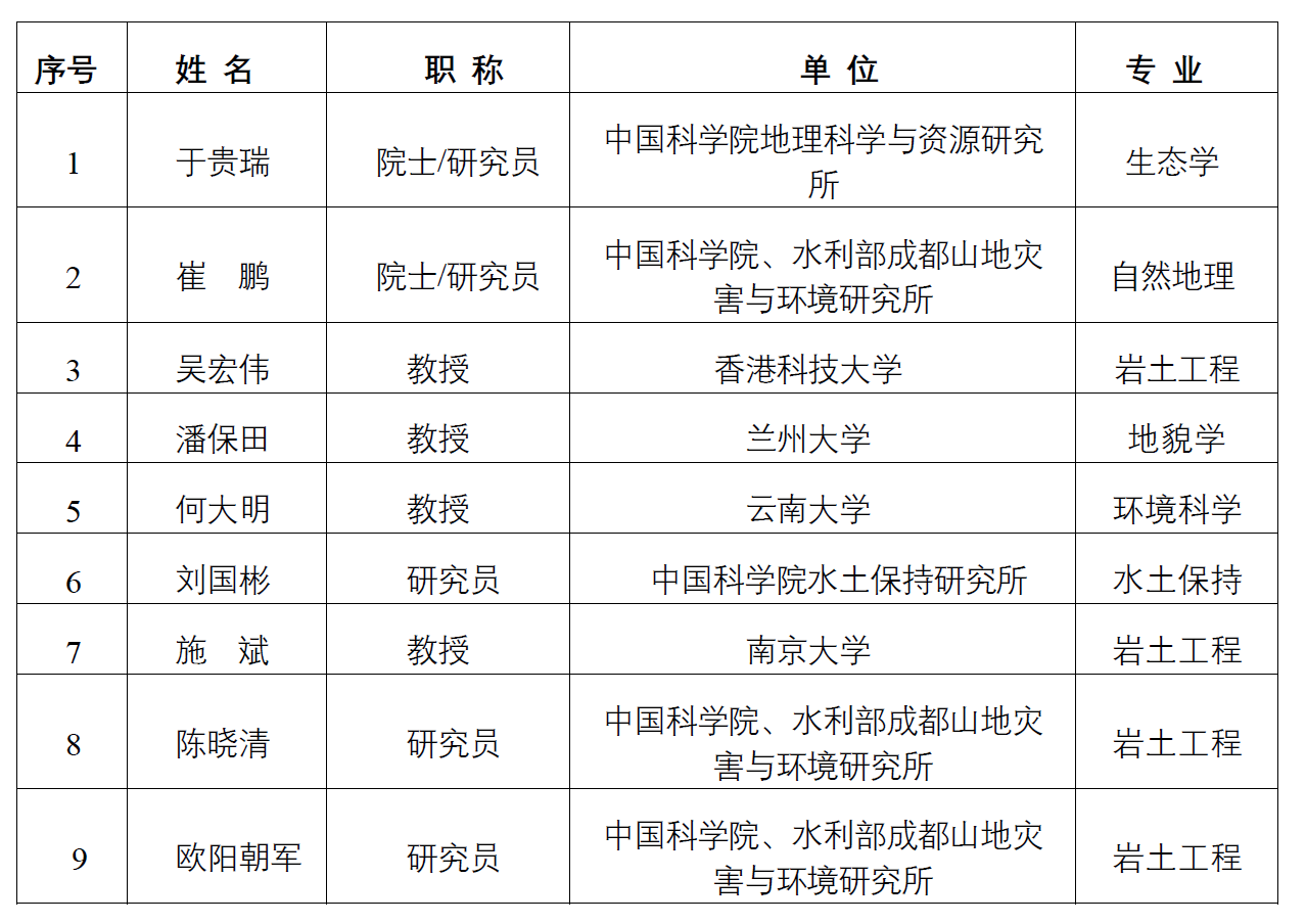 东川站学术委员会由我国地学、工程学领域著名专家组成,主任委员由著名地理学家、中国科学院院士崔鹏研究员担任,8位委员分别来自自然地理、地貌学、生态学、水土保持、岩土工程学等领域。学术委员会任期5年,主要负责审议并指导野外台站的研究方向、观测实验研究目标、重要学术进展等关键事项,为台站的科学研究和观测工作提供咨询建议。