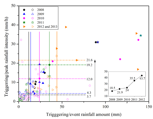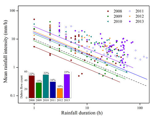 中科院成都灾害与环境研究所郭晓军助理研究员和崔鹏研究员团队针对上述两个科学问题,通过大量的泥石流灾害数据样本和丰富、加密的山区降雨资料,分析了地震灾区诱发泥石流的降雨特征,建立了汶川地震灾区泥石流的降雨阈值,通过对阈值的均一化,与国际上其他地区的降雨阈值进行了比较后发现,地震灾区降雨阈值低于世界上大部分地区,说明地震对泥石流的促进作用;同时研究了泥石流在不同地震烈度区、岩性区、气候区的分布特征,分析了泥石流在这些区域降雨阈值的空间差异,研究了阈值与地质条件、气候条件、流域面积等因子的统计学关系,并得出了11个比较严重的泥石流多发区的降雨阈值;另外,根据地震灾区植被恢复、物源条件的变迁,分析了降雨阈值的年度变化。
