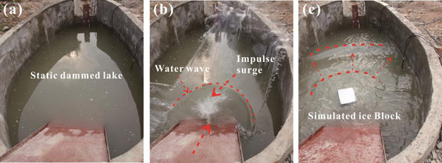 受全球气候暖化的影响,高山区气温升高加剧了冰雪消融、冰川退缩,冰崩、冰舌断裂等现象时有发生。冰崩入湖形成的涌浪不仅抬高湖区水位,增加冰碛坝所受水体压力荷载,还会改变冰碛坝受力条件。相关研究表明,冰崩涌浪已成为导致高山区冰湖溃决最主要因素之一。目前对冰湖溃决的研究主要集中在冰湖溃决与洪水演进、冰湖溃决危险性分析与风险评价,以及气候变化与冰湖变化关系研究等方面。而对冰崩入湖形成涌浪的动力过程以及冰崩涌浪对冰碛坝作用规律研究较少。在国家自然科学基金和成都山地所青年基金等项目联合资助下,成都山地所陈华勇副研究员及崔鹏研究员团队选择西藏东南地区帕隆藏布流域米堆沟冰湖为原型,以轻质滑块滑动入水形成涌浪来模拟天然条件下冰崩入湖形成涌浪,研究了不同体型滑块入湖形成涌浪的演进过程,分析了冰崩涌浪作用下坝面不同位置所受水体压力荷载变化规律,建立了不同体型冰滑块、滑面倾角以及不同滑动距离条件下,坝面所受最大压力荷载计算公式。