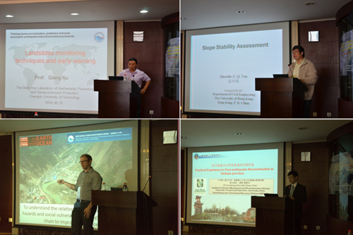 5月24日—25日为培训班集中授课阶段,培训班负责人成都山地所陈宁生研究员、苏立君研究员、尼泊尔特里布文大学Megh Raj Dhita教授分阶段主持培训课程。培训内容紧紧围绕“地震次生山地灾害风险评估与预测预警”主题展开,中国科技大学陈晓非院士、中科院成都山地所崔鹏院士、英国卡迪夫大学Tristram Hales博士、民政部国家减灾中心林月冠副研究员、香港大学岳中琦教授、成都理工大学许强教授与范宣梅副教授、中科院遥感地球所冯强副研究员、四川大学顾林生教授、第宝锋副教授、成都山地所苏立君研究员和陈宁生研究员等分别就“基于强地面运动模拟的震害预测”、“一带一路山地灾害风险控制”、“中国地震诱发滑坡风险韧性分析”、“空间技术在灾害管理中的应用”、 “边坡稳定性分析”、“滑坡监测预警”、“滑坡形成机理和风险控制”、“遥感技术在地质灾害风险评估中的应用”、“四川地震灾后恢复重建经验与教训”、“地震次生灾害与人类聚落风险及适应性研究”、“滑坡与崩塌防治技术”、“泥石流灾害预测预警理论和实例分析”等课程内容进行了讲授,授课内容引起了学员们的广泛兴趣和热烈讨论,也获得了全体学员高度的赞誉。