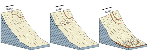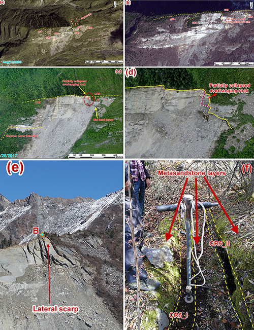 研究团队在海拔3500米的滑源区发现沿山脊线的顺岩层长裂缝和悬挂的危岩,在堆积区发现裂成三块的巨型岩石(60米长40米宽)。后期通过多期高清遥感影像和无人机相片,解译出“6.24”之前滑源区的六处崩塌体。该滑坡的地震波震动图也证实主滑动发生之前有一个小型的垂向撞击震动。由此,对“6.24”滑坡机制提出了新的解释,认为该大型滑坡是由于小型悬空岩体崩落撞击下方锁固段岩体,造成滑坡后壁裂缝贯通而形成的。具体的力学计算也表明,小型岩体冲击力至少比滑坡后壁孔隙水压力高一个数量级。这进一步证实了该触发机制的可能性。研究最后提出此类滑坡类似于自组织临界状态的沙堆模型。对于此类机制的滑坡,监测预警具有一定的局限性。