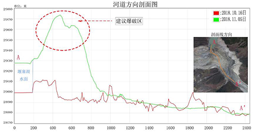 11月3日下午5时40分,金沙江白格“10.11”滑坡堰塞湖处山体再次滑坡形成堰塞湖。此次滑坡后缘顶部高程约3720米,距水面落差约850米,滑坡纵向长度约900米,最大宽度约360米,最大厚度约85米,体积约850万立方米。在上次堰塞坝残留体上,再次堆积约1050万立方米,形成的堰塞坝最大长度2100米,最大宽度700米,平均宽度约450米,堆积坝最高点高程3011米,坝顶横断面最低点高程2976米,堆积坝最大厚度约106米。
