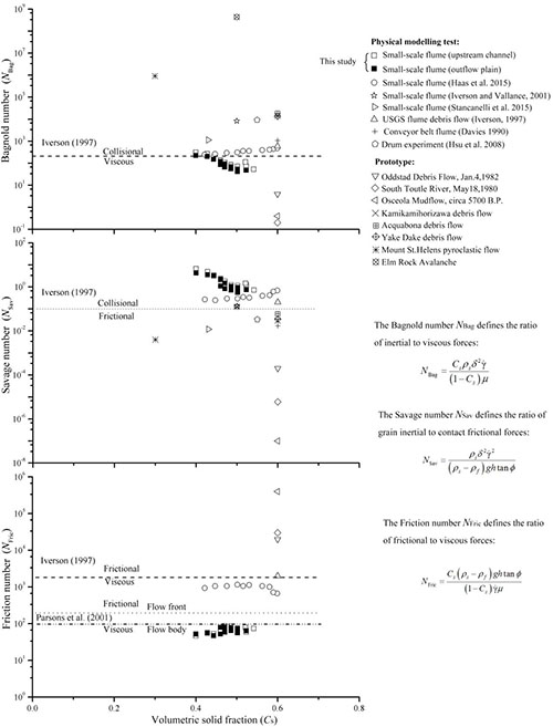 研究表明泥石流堆积扇的长宽比、面积和体积均与初始含水量呈正相关关系,最大堆积厚度则与含水量呈负相关关系;泥石流细颗粒含量的增加可以降低泥石流运动距离(高含水量如W=28.5%时除外);平缓的坡度变化可以促进更大的泥石流运动距离。进一步研究发现,泥石流堆积过程与颗粒分选现象密切相关,高含水量的稀性泥石流堆积地貌大多呈现明显的颗粒分选现象;高固相体积分数的粘性泥石流则难以产生明显的颗粒分选,而是呈现粗细颗粒混合均质化的堆积地貌。初步推断固相体积分数Cs=0.52是泥石流颗粒分选的界限值。