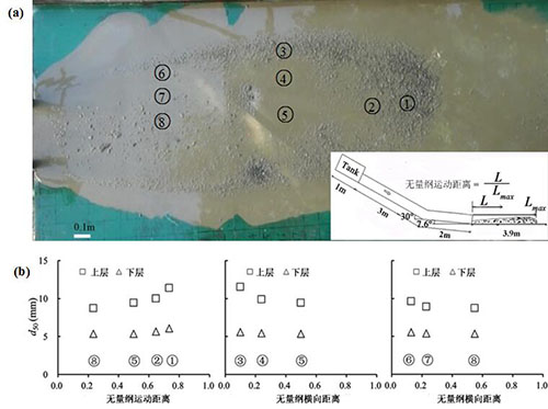 泥石流含水量W=40.0%时的采样位置(a)和特征粒径d50(b)