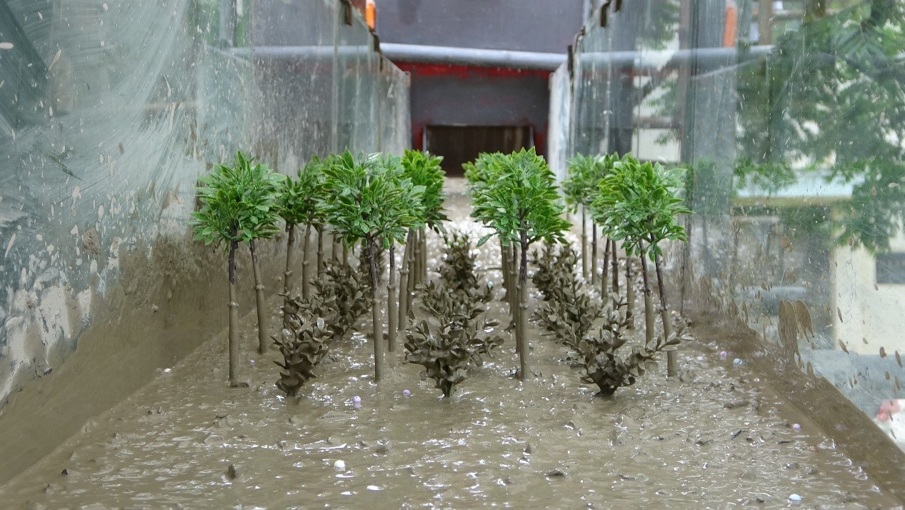 来站期间,两人先通过野外调查与分析,研究植被实地拦砂的效益和机理,并确定典型植被地表形态特征参数,为植物模型的制作提供依据。在野外调查的基础上开展了水槽模拟试验,根据研究目标和以往水槽实验的经验,通过改变以乔木和灌木为主的植被过滤带布置参数(如植物的株距、行距),分析布置参数的变化对乔灌混交植被过滤带拦砂效益(拦砂率、泥石流重度调节、粒径调节、淤积特征、流速调节、流量调节、泥石流到达时间调节)的影响,确定使植被过滤带拦砂效益最优的布置参数。在此期间,还与台站工作人员和其他科研学者展开了交流学习,观摩和学习了陈晓清研究员和周公旦研究员团队研究生开展的山洪泥石流冲击实验和冰湖涌浪实验。在东川泥石流观测站的学习工作中,两人对生物工程治理泥石流有了新的认识,同时为后续研究生态-岩土工程治理泥石流提供了可靠的实践和理论基础。