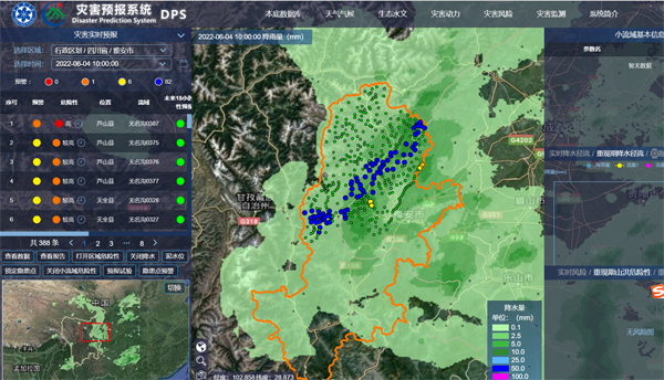 雅安地区汛期强降雨天气较多,构造活跃、地形地貌复杂,地震后易发生次生地质灾害。针对此次地震,该平台已实现了与四川省气象局实况和预报降雨数据的无缝衔接,开展降雨条件下山洪泥石流风险的高精度实时预警预报,可实时查看每一个小流域的险情演化情况。