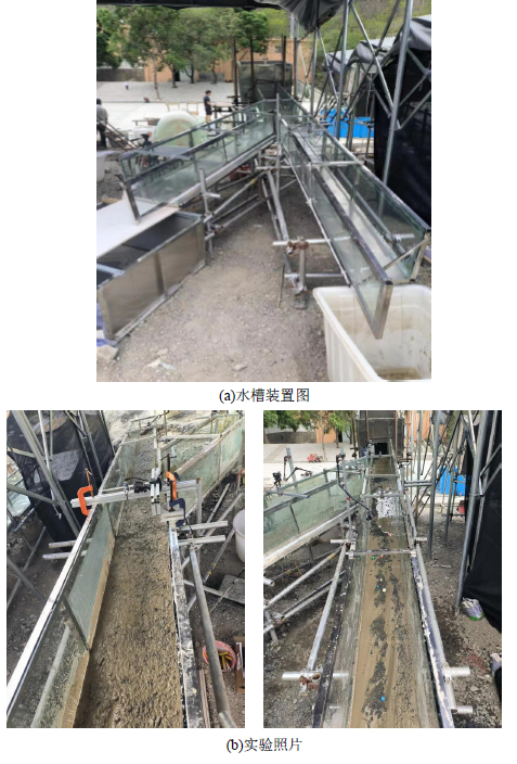 2024年5月6日至8月18日,在川藏铁路国家重点研发计划项目的支持下,成都山地所硕士研究生宗家明来站开展泥石流分流工程减灾技术研究,研究不同分流结构对于泥石流的分流控制机理。实验主要考虑分流槽与主槽的夹角、分流槽宽度、泥石流密度、分流坝高度共4种影响因素。水槽共分为三段,主槽上端长2m,宽0.4m,高0.4m,主槽下段长4m,宽0.3m,高0.4m,分流支槽长3m,高0.4m,而宽度为变量。实验主要观测项目为流速和泥深。为更加深入研究分流槽对于泥石流分流量的影响,实验中加入了无分流坝等特殊工况用于对比分析。
