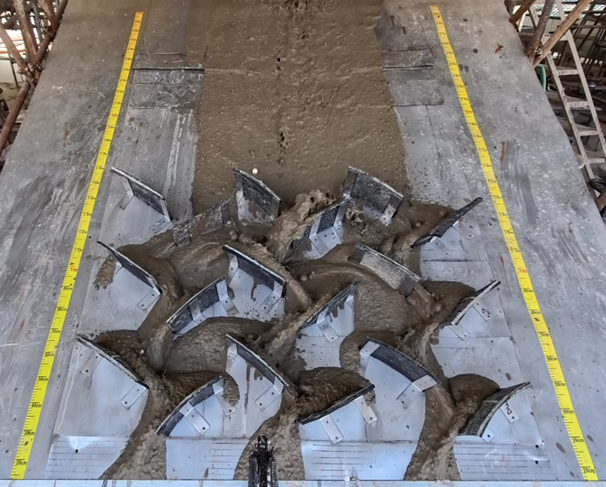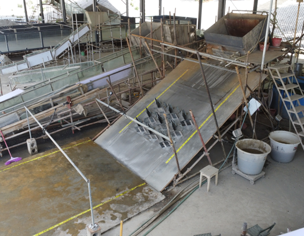 2025年3月-7月,成都山地所硕士研究生张桢聚焦废旧轮胎结构组合参数对泥石流运动与堆积行为的调控机理。实验设置了轮胎布设形式(类V字型布置、不同摆放角与行间距组合)及协同措施(轮胎与桩体、植被协同),重点观测了在不同布设工况下,泥石流的龙头流速、进出流量、质量拦截、动能削减及堆积形态变化等关键指标。