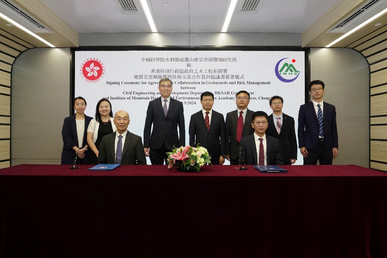 9月9日,成都山地所与香港土木工程拓展署在香港举行地质灾害风险管理技术交流合作意向协议书续签仪式。香港土木工程拓展署署长、太平绅士方学诚,成都山地所副所长陈晓清、苏立君出席。 2024-09-14