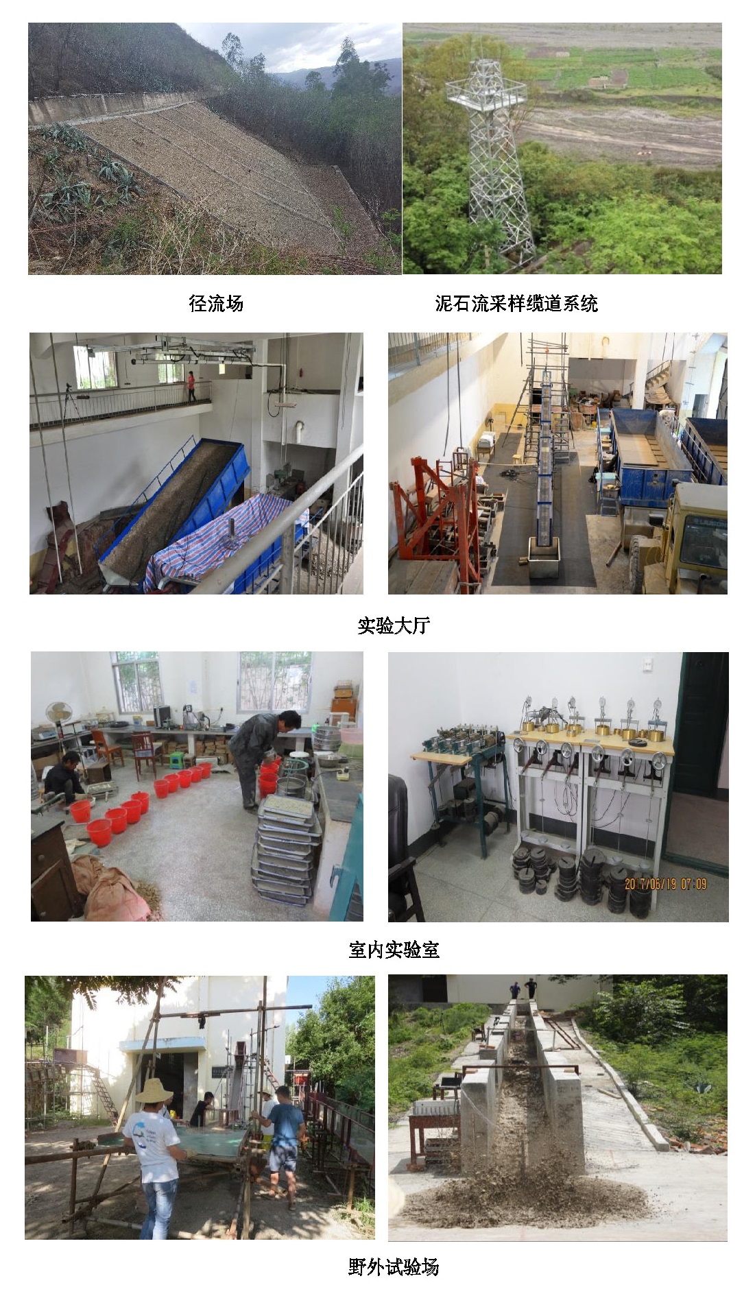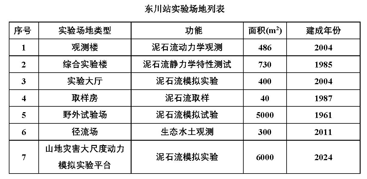 东川站野外实验观测场地主要包括径流场、野外模拟试验场、泥石流观测平台、山地灾害大尺度动力学模拟实验平台(简称“大平台”)等在内的观测和实验区,总占地面积12956m2。观测场地配备了先进的数据传输系统,包括有线和无线通讯方式,确保观测数据能够及时、准确传输。