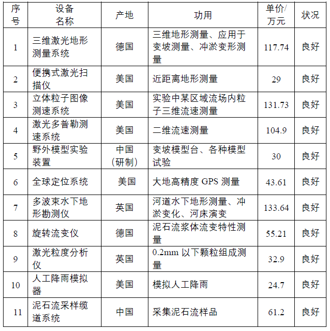 东川站已建成了包括径流场、野外模拟试验场、泥石流观测平台、生态试验场、雨量监测点等在内的观测和实验区(站区内),总建筑面积为2439平方米。其中,东川站实验室配备了德国Haake Rheostress600流变仪、英国马尔文MS2000激光粒度仪、GeoSwath Plus Compact相干多波束三维地形貌测量系统、Riegl三维激光地形扫描仪、Trimble R8GNSS(1+2)全球定位系统和自动综合气象观测仪等高精度的现代化测量仪器,建立了泥石流输沙和河床演变观测平台。此外,东川站建成了泥石流动力学模拟平台(包括粒子图像测速系统(PIV)、激光多普勒分相测速系统、层析成像分析系统、高速数码摄像机和高速自动比表面与孔隙度分析仪)、泥石流产汇流模拟实验系统(包括人工降雨模拟装置,德国的H-F-1地表径流量测量系统测量地表径流,流速和水位测量系统,植物冠层分析仪和多功能植物图像分析仪)。