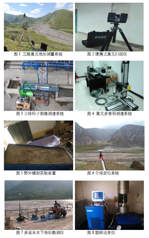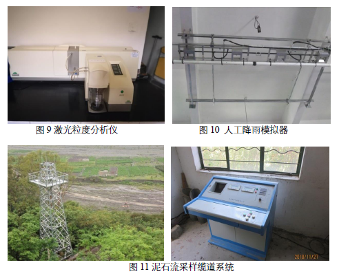 东川站在50多年的流域泥石流观测研究的基础上,逐步摸索形成了一套较完备的观测系统和网络,基本能满足蒋家沟48.6km2泥石流形成-运动-堆积全过程各阶段的观测需求,部分野外观测仪器见图7.5。东川站在蒋家沟及小江流域新布设了3个梯度气象站、15个雨量站用以观测流域内空气湿度、温度、总辐射、土壤水分、温度、实时雨量等,同时监测泥石流形成过程中雨量及土体力学性质的变化;在泥石流运动区,新布设了土壤水分温度采集仪、泥石流地声监测仪、泥石流运动图像采集仪、激光阵列测距系统(流速场)、泥石流采样缆道,用以监测泥石流运动中的地声、泥位、流速、流量、输沙量等动力学参数及采集泥石流样品。此外,在蒋家沟及小江汇口附近,新布设了水文观测仪器,用以监测小江水位、流速、含沙量等。